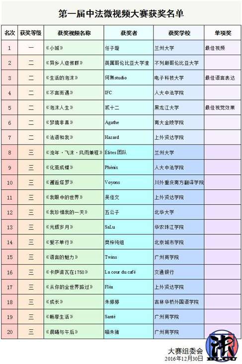 2016年9月,我校外语学院13级法语专业学生参加了由北京语言大学主办的全国首届法语微视频大赛。经过激励的角逐,三组队伍进入了复赛。12月底,大赛落下帷幕,三组同学分别获得了一个二等奖及两个三等奖,在与知名高校及兄弟院校的交流切磋中表现优异。获得二等奖的刘政鑫同学以幽默诙谐的视角展现了法语学习中的趣事;吴佳文、吕春芬及赵扬同学则以或文艺或诗意的基调体现了法语对她们的学习及生活的影响。总体来说,三组作品既有创意又有才情,很好地展现了我校法语专业学生的积极向上的风貌。