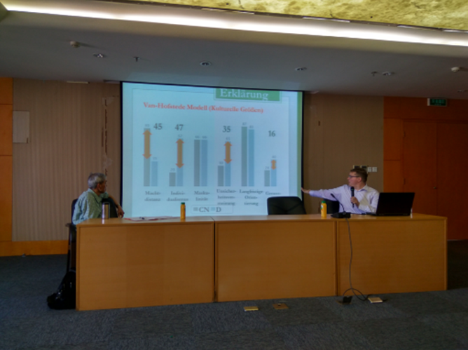 此次讲座的主讲人是德国Krone公司在华技术顾问Martin Gassner先生。在简短的自我介绍之后,同学们对他也渐渐熟悉起来。这位来自巴伐利亚州,学习酿酒专业,生活在靠近德奥边界的友人从小到大接触着两种甚至以上的文化,他操着独特的方言,风趣而又幽默。在活动中,他以自己的亲身经历为我们讲解了他眼中德国与中国的文化差异。