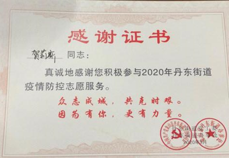 在志愿者活动结束时,浙江省宁波市象山县丹东街道为其颁发了感谢证书,让贺莉斯同学备受鼓舞。