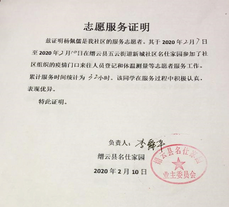 2020年2月7日清晨,杨佩儒同学就来到镇防疫指挥部报到,被安排到浙江省缙云县名仕小区值班点值守,担负着为进出小区居民测体温、填写出入登记表、上门对返乡人员进行健康监测、小区里巡逻、劝导积聚扎堆人群等任务。工作并不总是顺利的,在劝导工作中,会遇到某些不理解志愿者工作的居民,如他们嫌登记麻烦,有的说话不好听等。遇到这些情况杨佩儒同学总是耐心地解释防疫的重要性,在疫情期间请大家多担待,小区登记是为了大家的安全。还有一些老年人由于缺乏对疫情的了解,对新型冠状病毒充满恐惧,在防疫方面一无所知,杨佩儒同学会积极主动耐心地和他们讲解防控知识,采取一些必要的个人防护措施,得到居民们认可和赞扬。