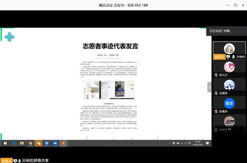 学习之后,支部书记孙琳老师和与会全体党员分享了在抗疫一线感人的先进人物和事迹,同时孙琳老师对我们学院开展学雷锋活动月以来,党支部提出捐款倡议、抗疫作品征集、志愿者号召等项活动进行了总结。随后学生党员张元方、王佳莉、薛燕云、陈晓琳等同学介绍自己参加抗疫志愿者的经过、经历和她们的亲身感受。