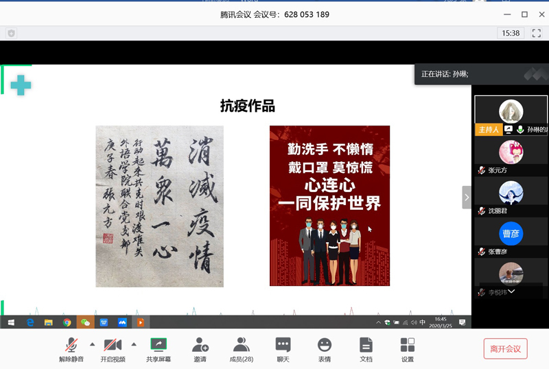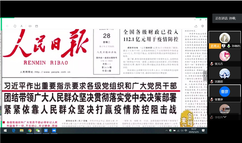 2020年3月25日下午4点30分,在党总支的号召下,外语学院联合支部学生党员组以“疫情防护,党员先行”为主题,开展线上主题党日活动。活动由学院联合支部书记孙琳主持,支部全体学生党员参加活动。