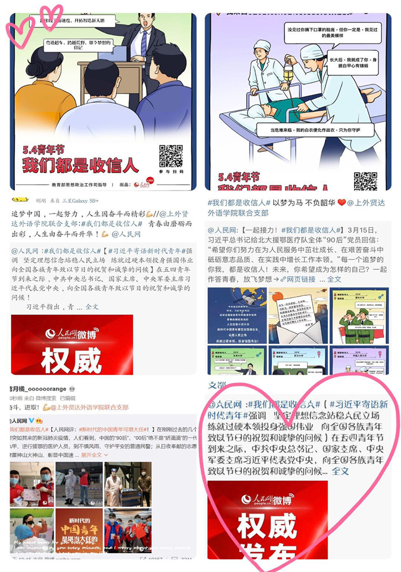 主题教育首先学习了习近平总书记在2019年纪念五四运动100周年大会上重要讲。外语学院联合支部党员们从“用青春践行五四精神,展现伟大的爱国情怀”、“面对艰难险阻,新时代中国青年要勇于砥砺奋斗”和“把青春梦与中国梦紧密结合起来”三个角度进行思考学习,对习总书记讲话精神有了进一步的理解。同时,联合支部积极响应教育部思政司5月4日9:00在人民网新媒体平台推出“我们都是收信人”H5小程序活动,学院全体学生党员、发展对象、积极分子积极关注@人民网法人微博,带话题#我们都是收信人#转发@人民网置顶的活动相关微博,并@上外贤达外语学院联合支部,参与评论互动,助力主题活动。