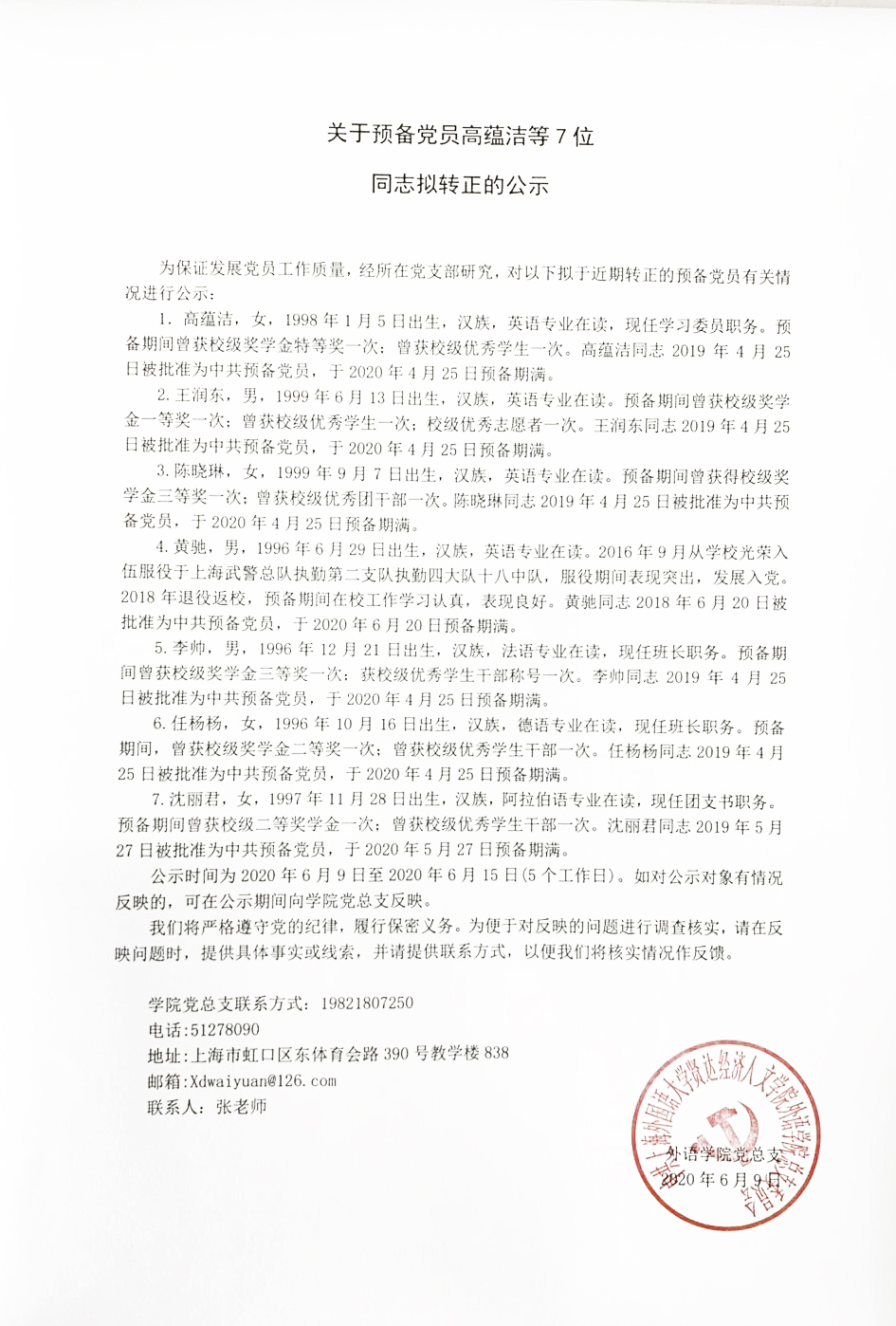 关于预备党员高蕴洁等7位同志拟转正的公示