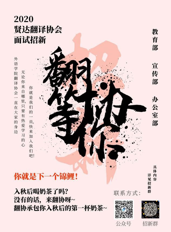 外语学院严丹丹老师十分重视这次面试招新活动。在活动开始前布置在校内进行海报和线上宣传,欢迎来自不同学院的新同学加入翻译协会,让有能力的同学提供展现自我的机会,同时使翻译协会增加新鲜血液,增添活力。