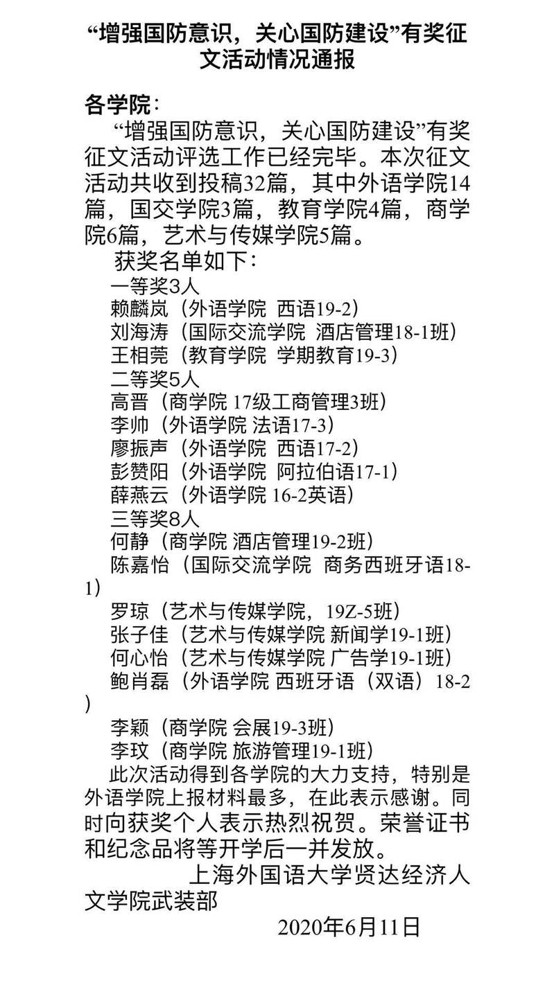 在5月校武装部开展的“国防征文有奖”活动中,我院学子热血沸腾,纷纷用笔抒写了关于国防建设的心得体会,共投稿14篇,为全校投稿最多的学院。经评选我院有1名学生荣获一等奖,3名学生荣获二等奖,1名学生荣获三等奖的好成绩。学生们用实际行动支持国防建设,增强国防意识,更加意识到使命光荣、责任重大。