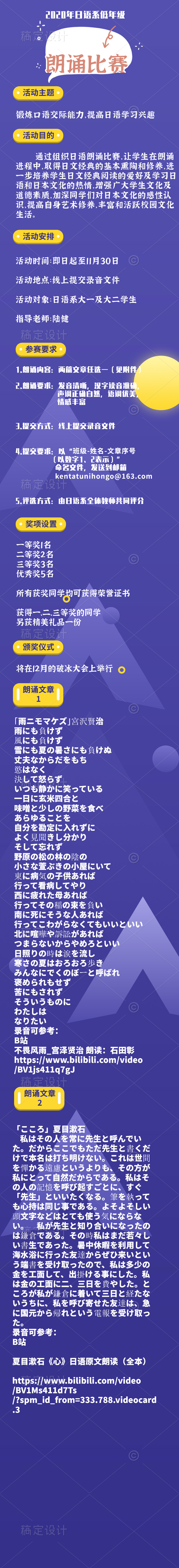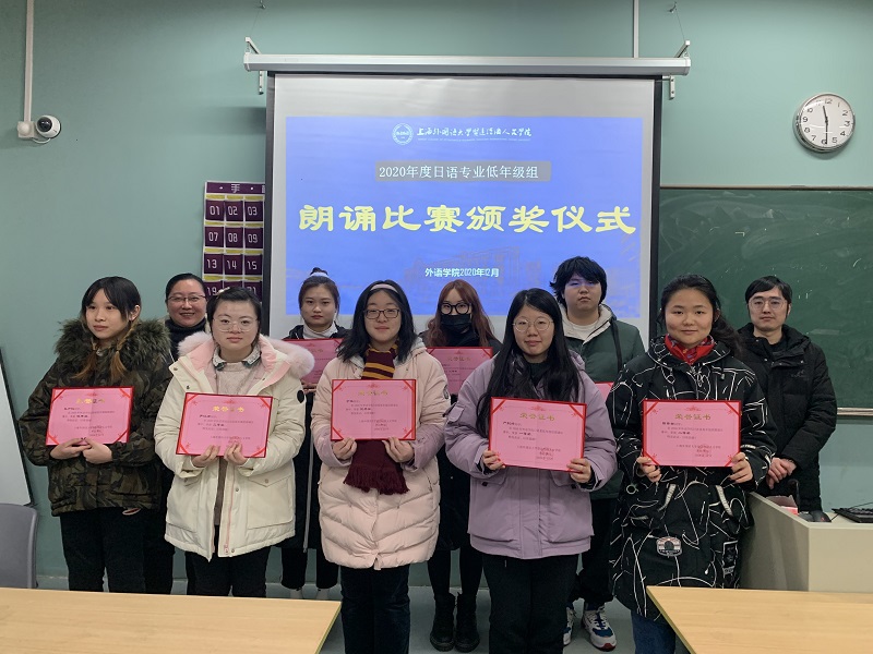 2020年日语系低年级组朗诵比赛,在低年级组长陆健老师精心准备和安排下,日语系低年级同学积极报名参与,经日语系全体教师紧张而认真的评选,于12月1日圆满落下帷幕,共评出一等奖1名,二等奖2名,三等奖3名,优秀奖4名。
