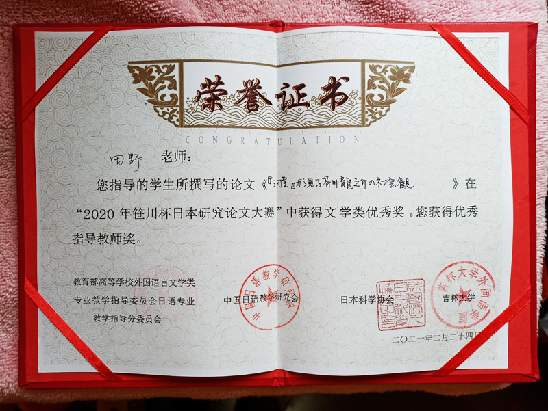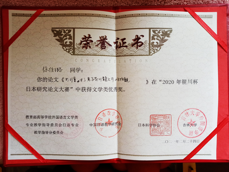 经过长时间的评审,组委会最终从每个类别中推选出10篇论文参加本次论文大赛的总决赛。另外有125篇论文获得本次论文大赛的优秀奖,其中语言学类30篇,文学类30篇,社会文化类65篇。我校外语学院日语系有两名学生参加该大赛,其中17级学生徐佳璐同学的作品「『河童』から見る芥川龍之介の社会観」(=《从小说<河童>看芥川龙之介眼中的日本社会》)在本次大赛中获得文学类优秀奖。指导教师田野老师获得优秀指导教师奖。