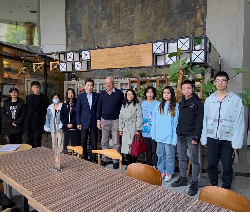 在茶话会上,高瑞霞老师时刻都在引导同学们与外教交流。外教老师给我们讲述了“君子不器”和“白马非马”的含义,他对中国文学和文化的了解让同学们惊叹不已!外教老师还给我们简单介绍了他的家庭和他的兴趣爱好等方面轻松愉快的话题。最后参加茶话会的同学们与老师还有鲍董事长一起拍照留念。