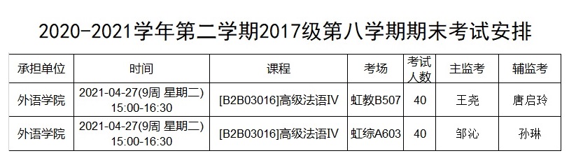 2020-2021学年第二学期2017级第八学期期末考试安排
