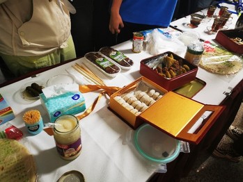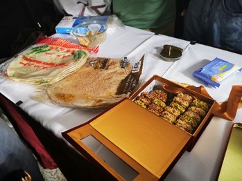 同学们提前到场地。在外教老师的帮助下进行布置,张贴主题海报、摆放餐具和食物、准备汉娜和水烟。四点活动正式开始,区域成员换上阿拉伯特色的服装在负责区就位,恰巧吸引了一大批刚下了课的同学们经过。大家纷纷驻足品尝和体验,原本静悄悄的综合楼一楼大厅顿时变得热闹非凡。