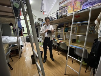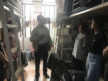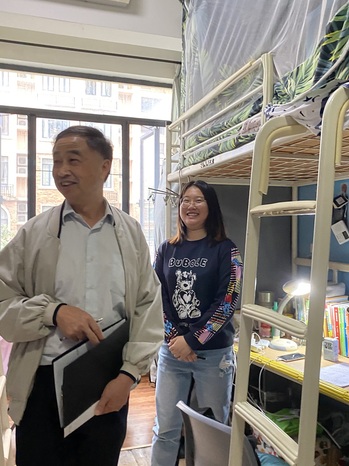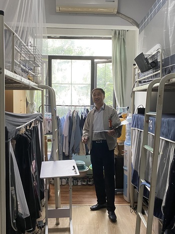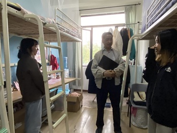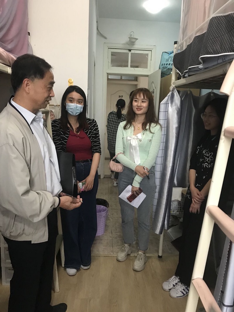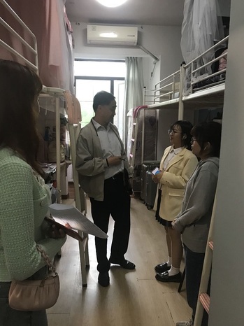5月20日,外语学院党总支余其华书记带领辅导员和学生骨干进行了最后一轮检查。余书记每到一个房间对同学们进行亲切问候,同时关心同学们的学习和生活情况,还嘱咐大家:宿舍安全卫生不是一天两天的事情,要每天都保持下去。余书记对好的宿舍进行了当面表扬,存在的问题也当面指出,要求同学们改进。