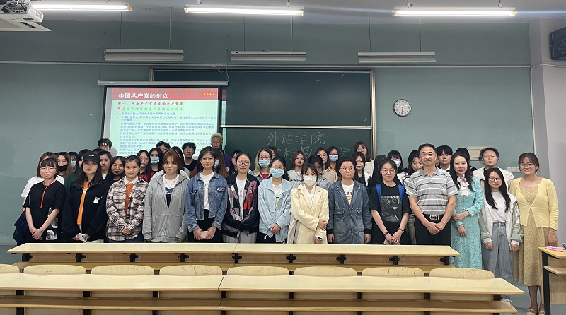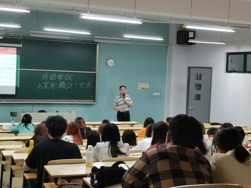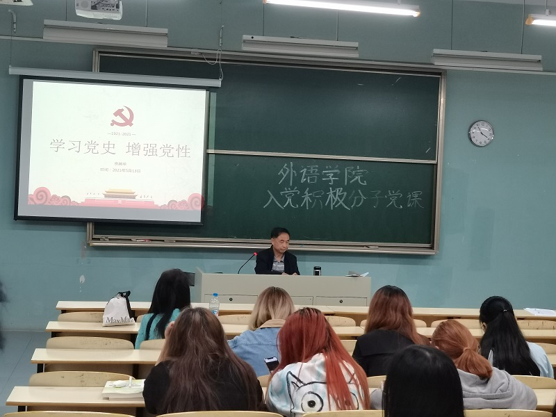 5月13日下午在外语学院学生党支部委员房丽珠老师的组织下,外语学院党总支在崇明校区举办了以学习“百年党史,做时代新人”为主题的党课。参加党课的有大一、大二入党积极分子80人左右,由外语学院党总支余其华书记主讲。本次党课是在中国共产党成立100周年之际,外语学院为了加强对入党积极分子的培养和教育的情况下举办的。