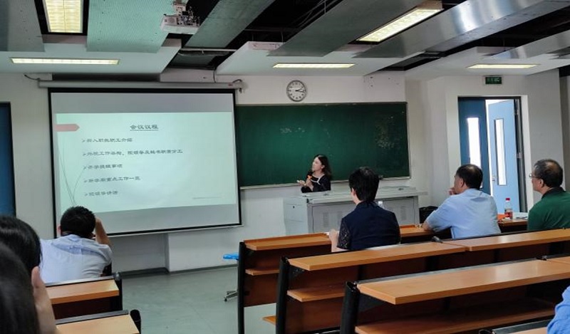 会议伊始,首先邀请15名新入职教师上台与大家见面并进行简单的自我介绍。之后由钱主任介绍了外语学院新的工作框架、院班子及教秘的职责与分工、上班作息时间以及联系方式等。