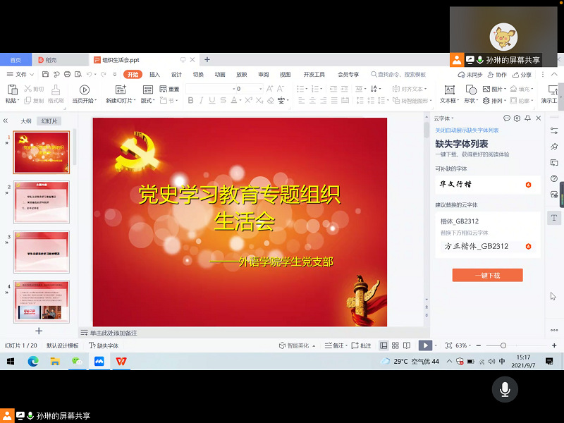 学生党支部由孙琳书记报告了半年来的支部工作情况,外语学院学生党支部紧密围绕建党百年主题,把学史明理、学史增信、学史崇德、学史力行贯穿始终,采用主题讲座、知识竞答、参观学习、网络学习等多种形式,形成了系列特色教育活动。同时孙琳书记对党支部存在的问题进行了认真的剖析,也提出了下一步的整改措施。