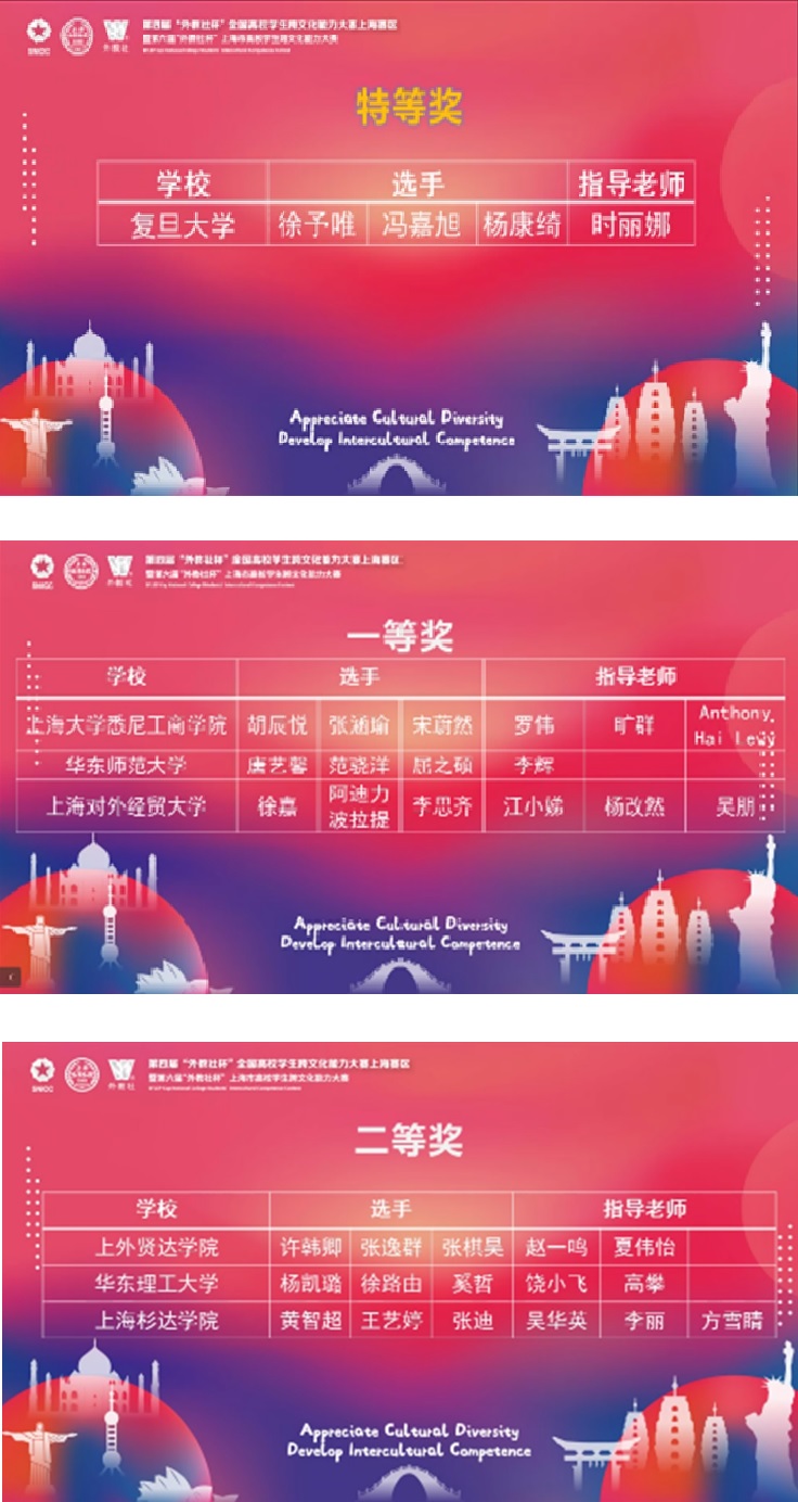 附:第六届“外教社杯”上海市高校学生跨文化能力大赛特等奖、一等奖、二等奖获奖名单。