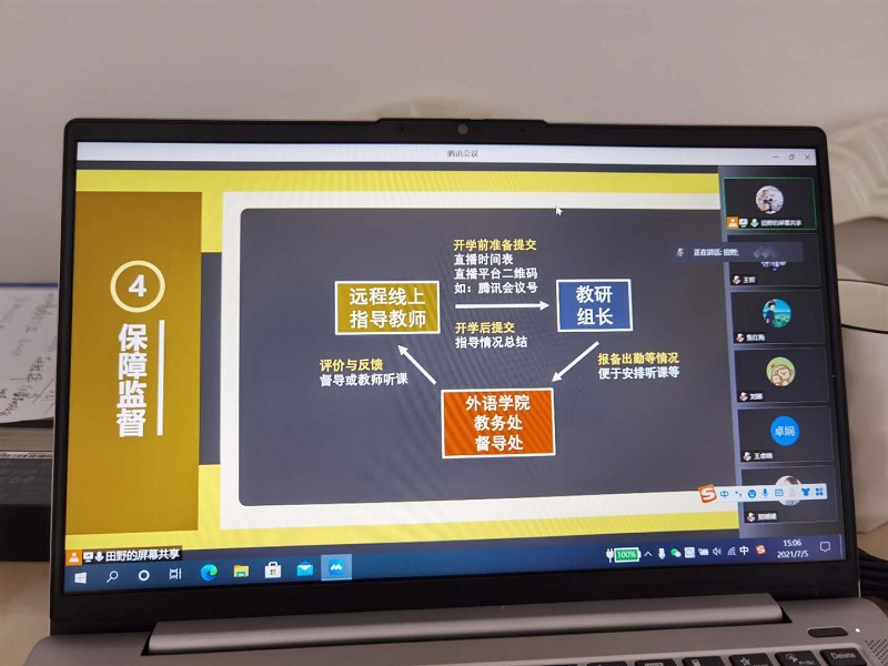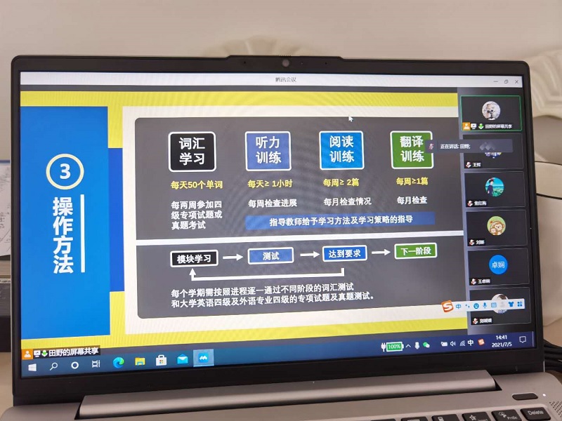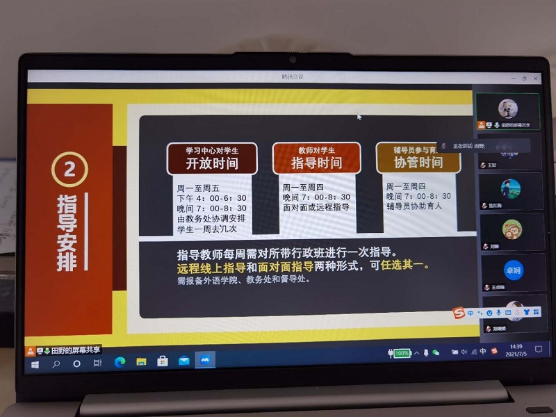 为了加强自主学习中心资源库的建设,为同学们创造良好的自主学习空间,打造外语学习新模式,外语学院从暑期至今花了不少精力与心血。在2021年7月5日,外语学院组织了对外语教师全覆盖的学习与培训。培训会议由外语学院王哲副院长主持,冯奇院长就自主学习中心建设的构想、设计、学习效果、未来规划等方面的内容做了主旨发言;田野老师播放了2个小时的培训视频,从自主学习中心基本情况、指导安排、操作方法和保障监督四个方面进行了详细介绍,以便供教师们在暑期学习和使用。外语学院领导和教师们集中精力,放弃休息时间抓紧建设,为自主学习中心的正式运行打下基础。