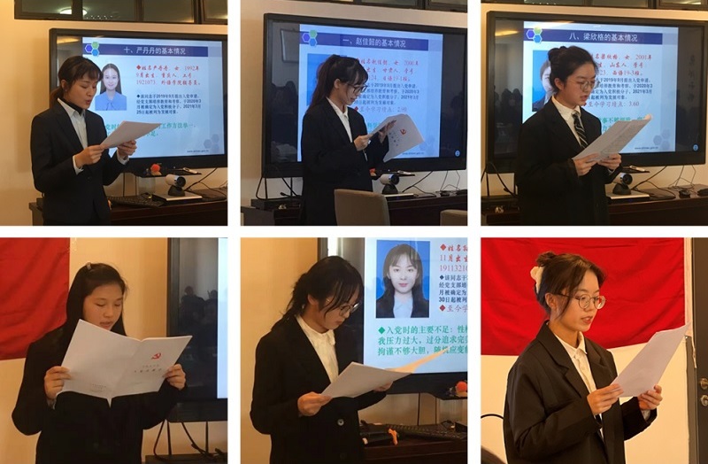 审议大会首先由发展对象宣读入党志愿书,重点向党组织汇报对党的认识、入党动机、个人表现等情况。入党介绍人分别介绍其在政治思想、学习、工作、生活等方面的情况,并指出不足之处;房丽珠老师代表支部报告对发展对象的审察情况,通报党内外群众的意见。最后经过与会正式党员投票表决,大会认为赵佳懿、李姗姗、龚奕伦等13名同志基本符合预备党员条件,一致同意接收他们为中共预备党员。