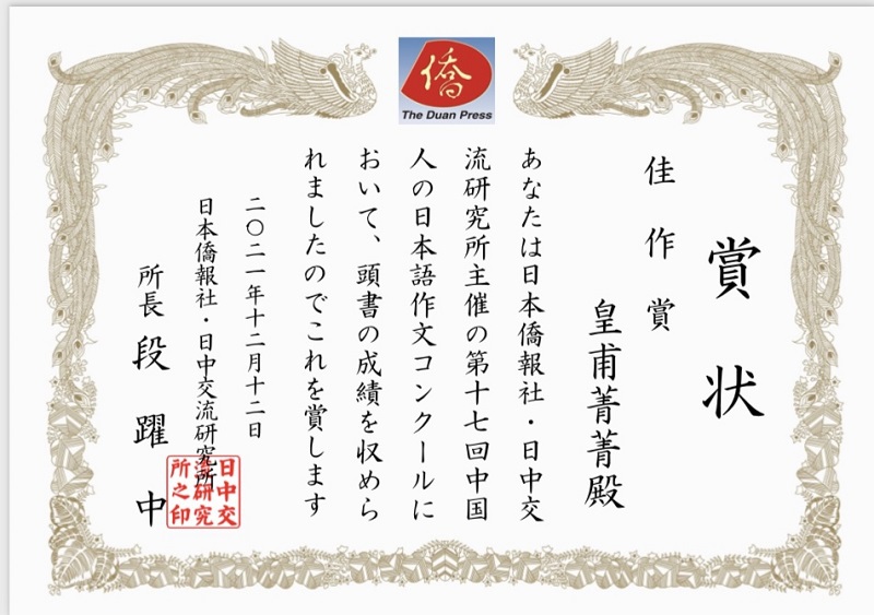 本大赛是由日本侨报社日中交流研究所主办,日本驻华大使馆、人民日报社、人民网、中国中日友好协会等机构协办,是一项影响力较大的国际性大型赛事。自2005年起至今,大赛已连续举办17届,今年全国近200所院校报名参赛。皇甫菁菁同学凭借作文《创意闪光——我校老师的教学方法》在3198名参赛选手中脱颖而出,荣获佳作奖。