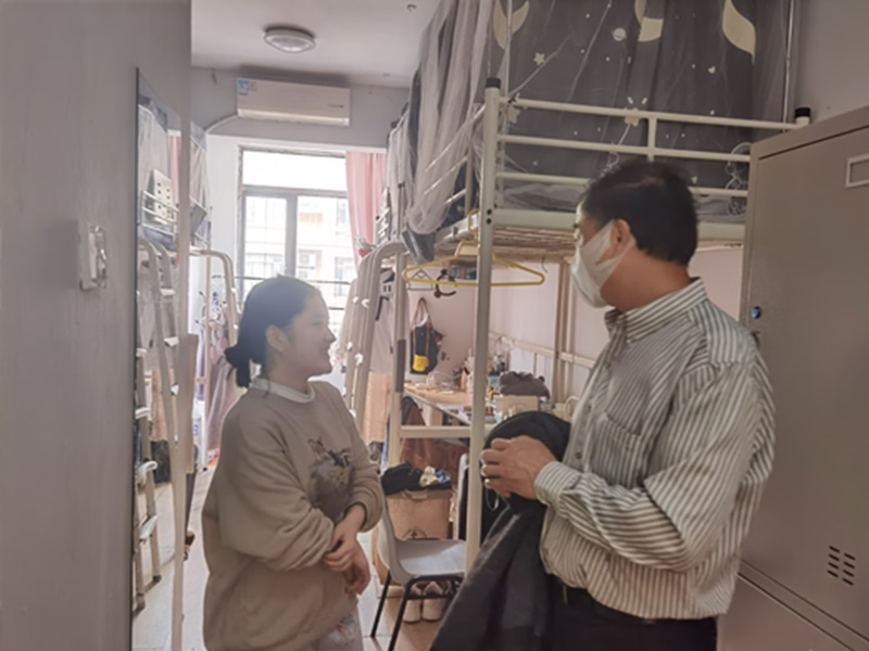 外语学院崇明校区在校学生分别住在A、B、C、D、22和24栋楼。走访小组成员有:余其华书记,房丽珠、李雪、刘鑫娜老师,还有两名学生志愿者一共六人。走访内容:一是查看同学们学习情况;二是宿舍卫生和环境;三是在封控期间同学们的适应情况等等。