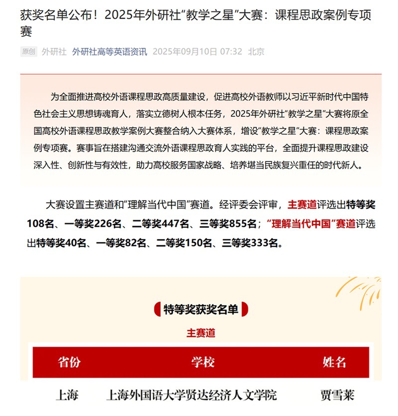 9月10日,2025年外研社“教学之星”大赛课程思政案例专项比赛获奖名单正式公布。我校外语学院贾雪莱老师凭借扎实的理论基础与独特的思政视角荣获全国特等奖,充分展现了我院教师在课程思政建设与外语教学融合方面的深厚底蕴与创新能力。
